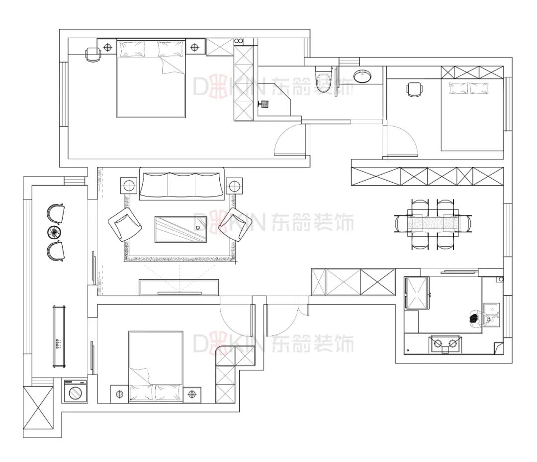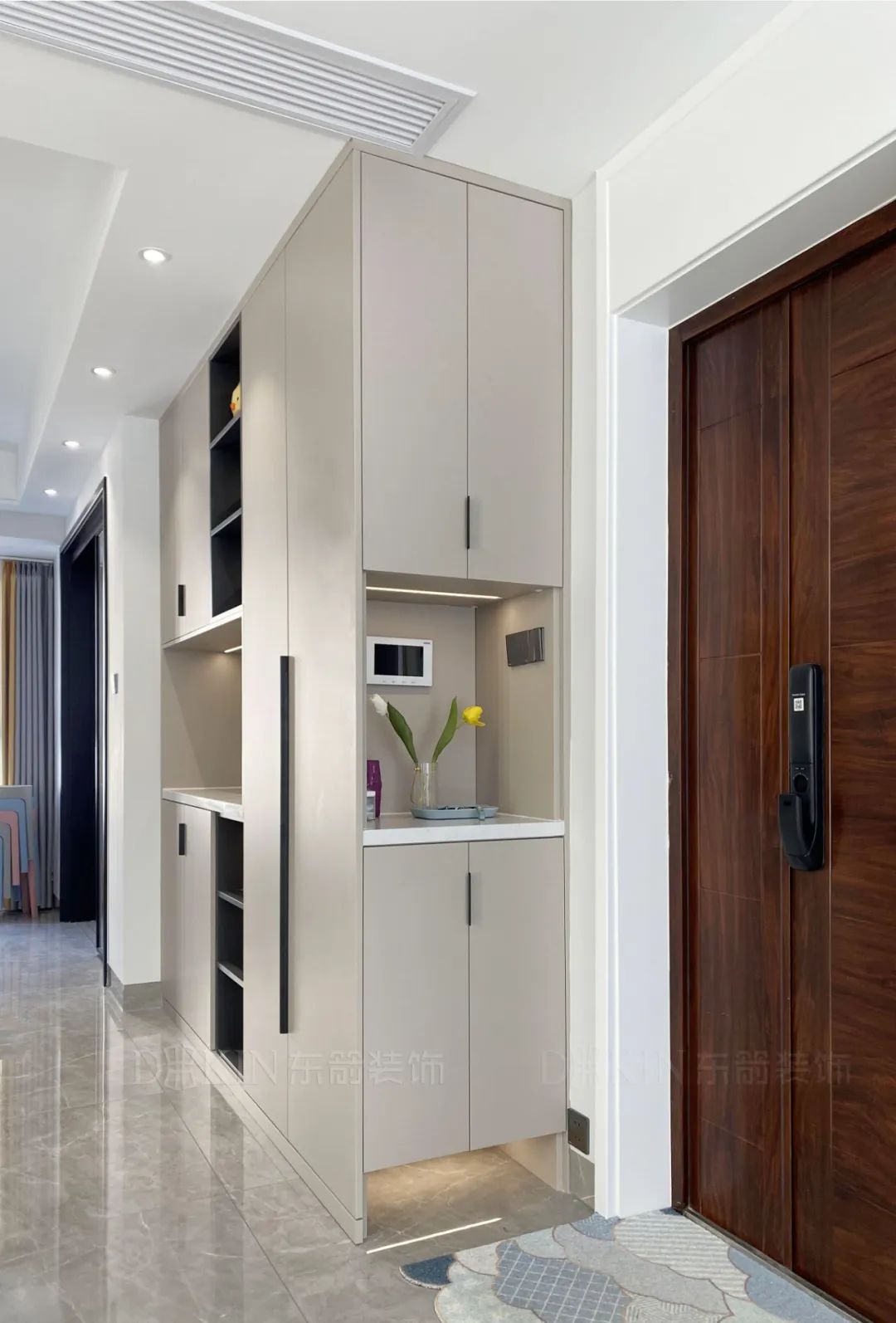 餐厅区域沿用与客厅相同的基调,开放式餐桌合理利用空间,同时也满足多人用餐的需求。为了更好的打开空间视觉,弱化了玄关空间的存在感,将玄关收纳功能与邻近的空间功能与结构进行整合。