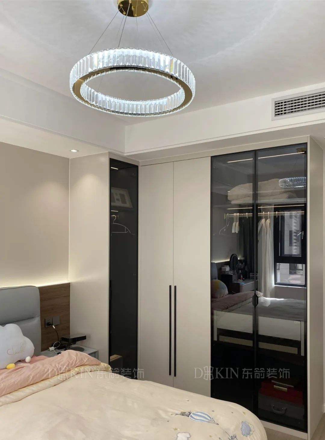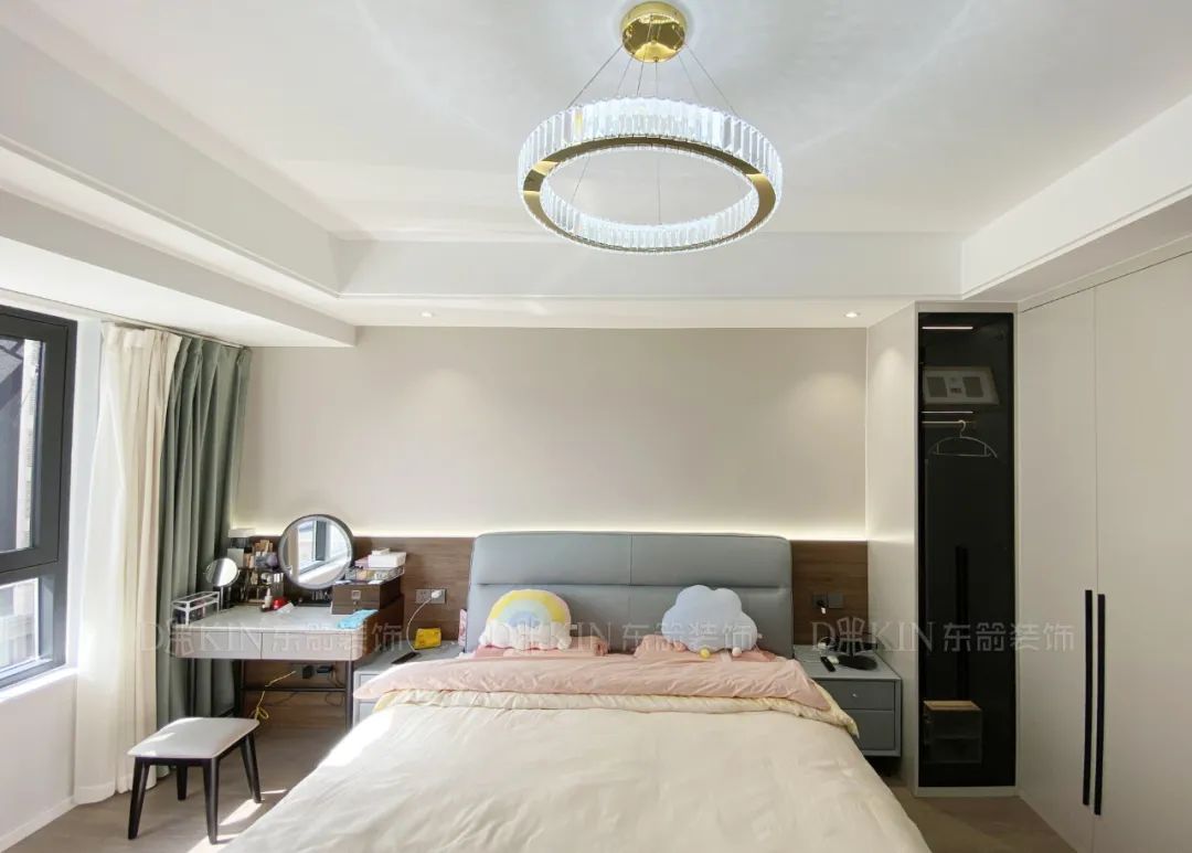 主卧通过对材质比例的运用增添空间格调,吊顶的照明灯饰与整体的氛围十分搭配。卧室采光非常好,没有用复杂的家具扰乱整个格局和打破整体的设计。米色大衣柜的设计提高了衣物收纳,增加了实用性。