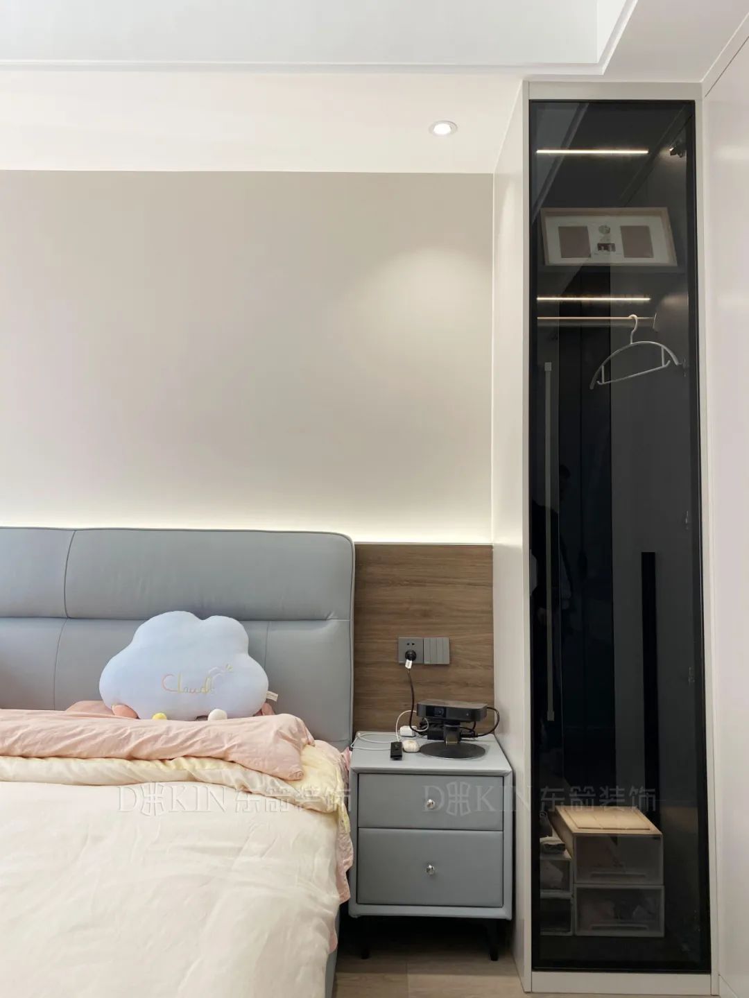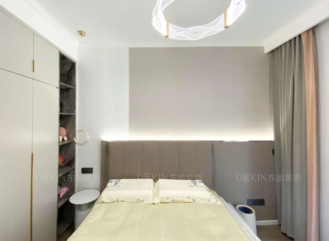 次卧室中的色调与公共空间相呼应,采用了白色,撞色窗帘点缀整个空间,让嘈杂的生活瞬间安静下来,带人走入静谧舒适的休憩氛围。