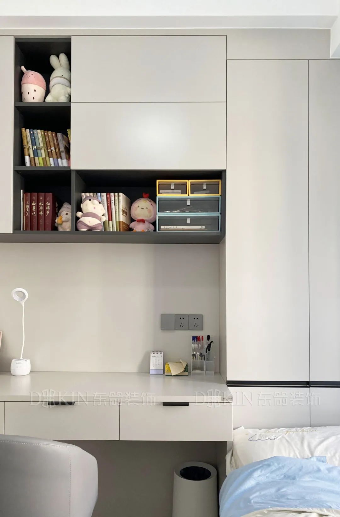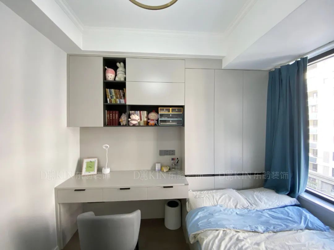 打造了收纳的柜子和工作的桌子,提高了整个空间的实用性。灰白色的木质衣柜和桌子与蓝色系的窗帘形成撞色,凸显卧室的温馨。