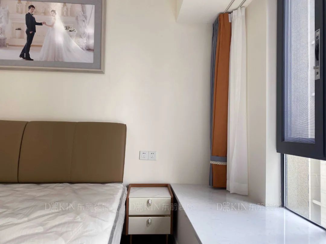 阳台的另一侧采用玻璃门与卧室隔断,卧室采光极好。打造了抽屉和柜子用于收纳,提高了实用便利性,满足住户多重需求。