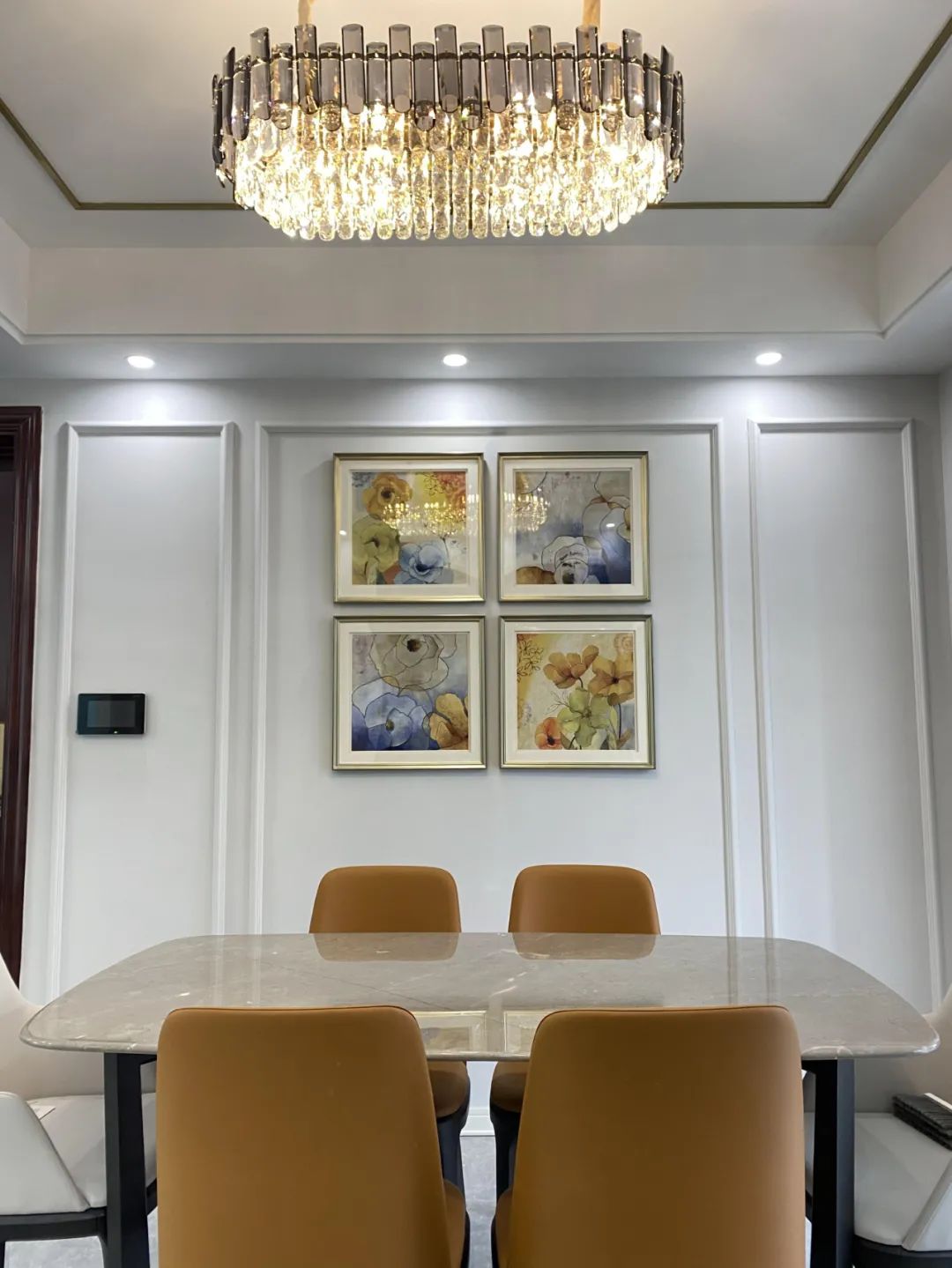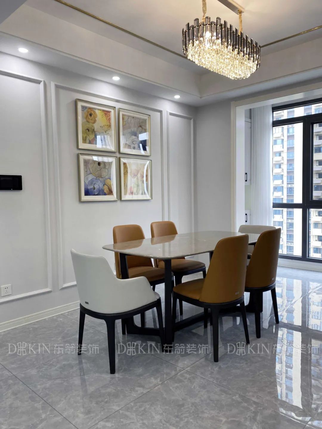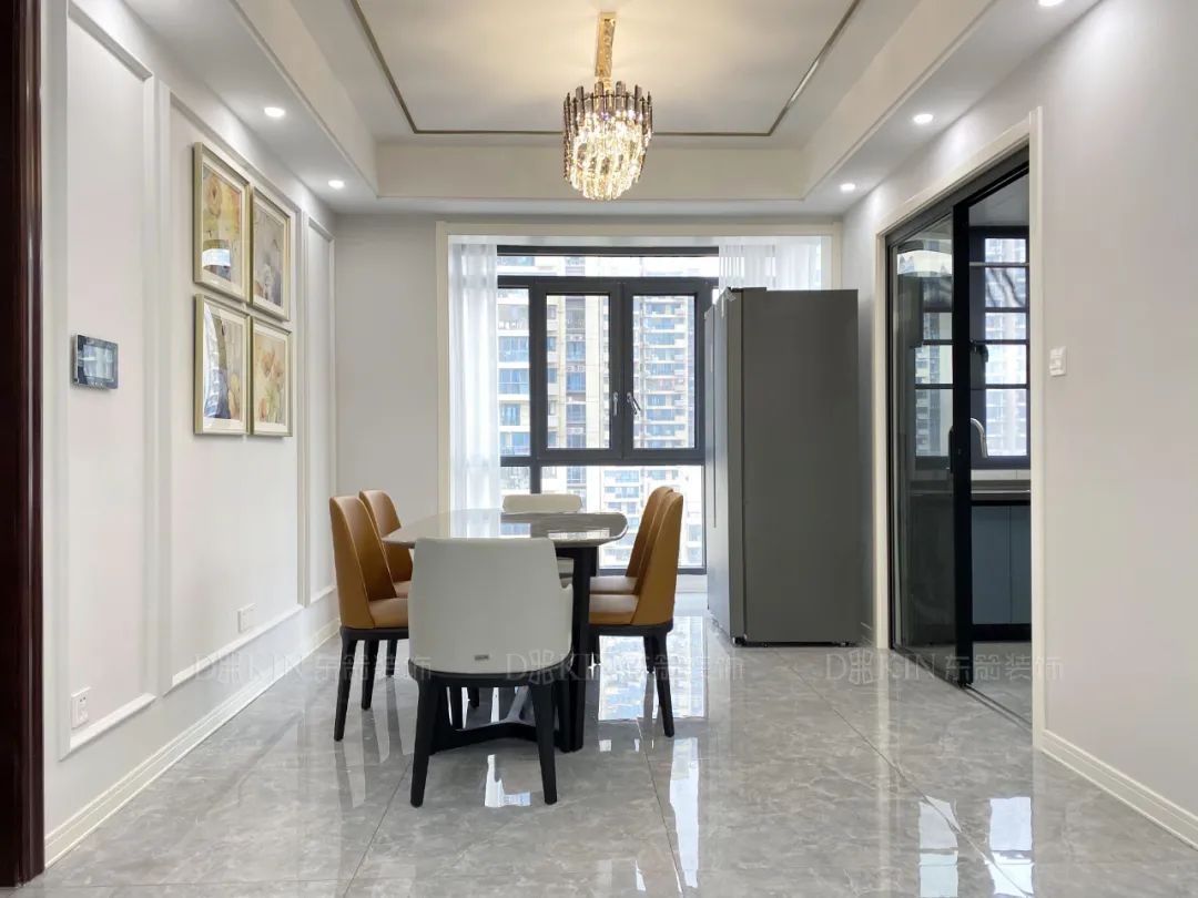 客厅、餐厅、阳台彼此互相贯通,撞色的餐桌椅显现稳重温润,搭配上头顶的金色灯具,视觉色彩,质地的对比,为空间增添了很多灵动的细节,为恬淡的生活注入了仪式感。