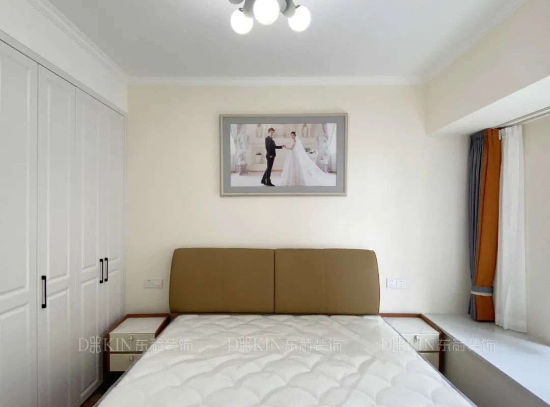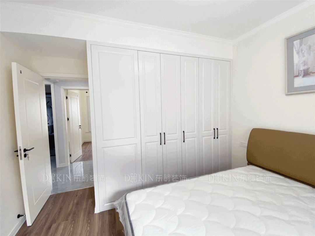 卧室定制了白色系衣柜,与窗帘的颜色相呼应,色彩的碰撞显现出简洁大气,造就了安静、治愈又不失高级质感的空间,衣柜的设计增大了衣物收纳,实用性很强。
