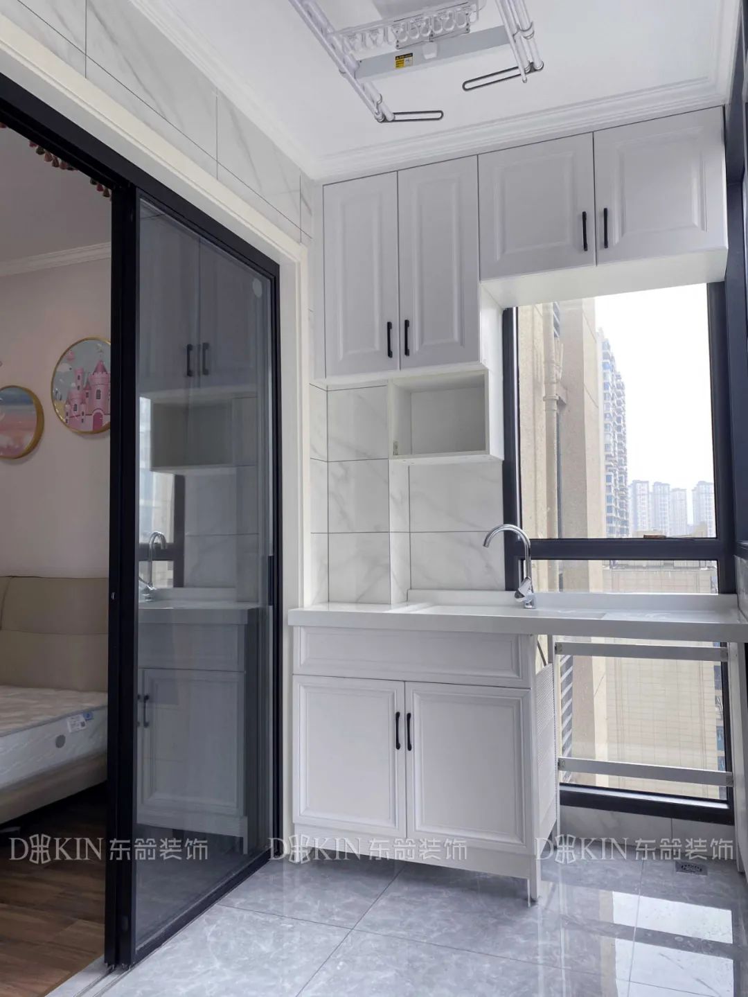 阳台一侧做成落地柜,扩大了家居生活用品的存放空间,采用白色色调,天生就有治愈感,窗边景色清雅无双,再配上明亮的采光,增添了惬意感。