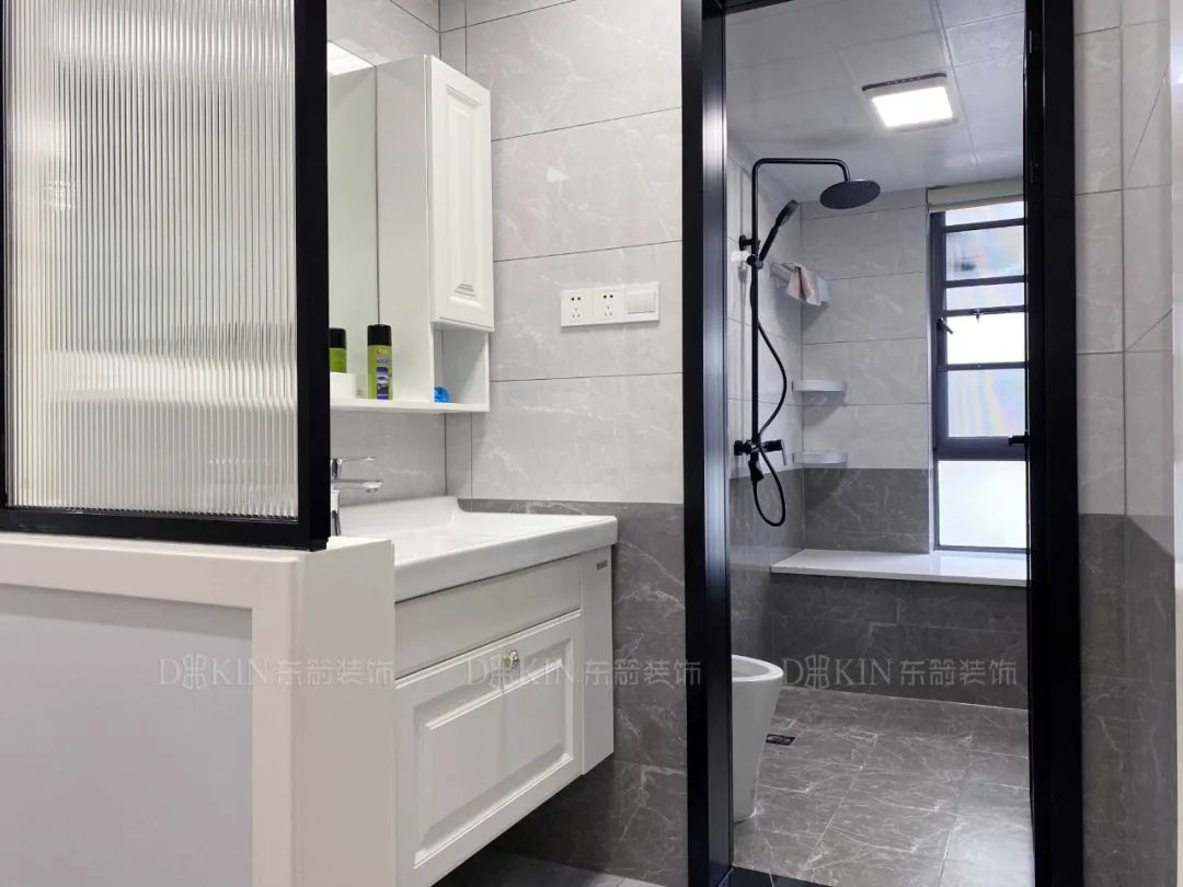 浴室采用干湿分离的设计,悬空浴室柜色和谐养眼,柔和的白色系总是让人感到安心。地面深灰色地板非常耐脏,与浴柜颜色相互协调,打造出沉稳与高级的质感。