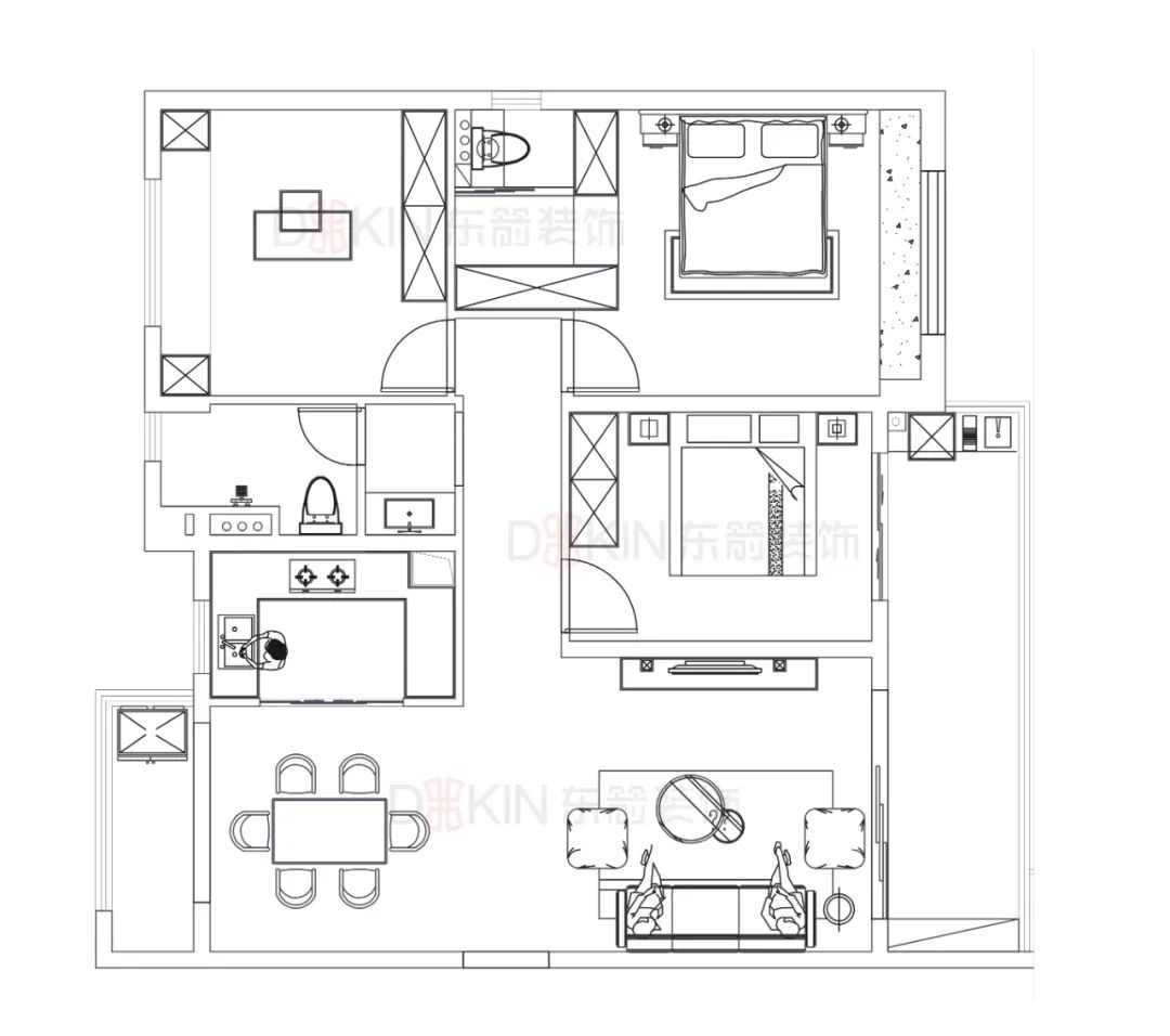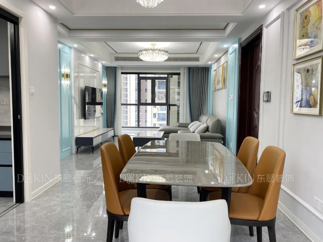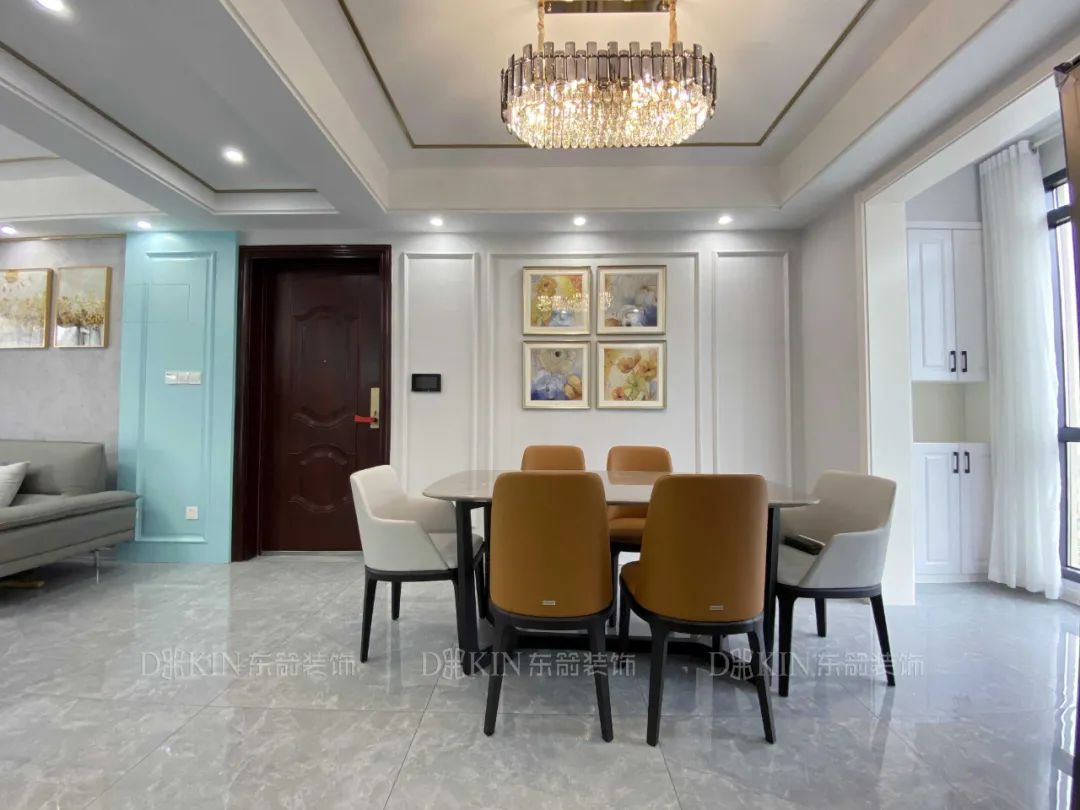 打通客餐厅视觉上空间面积显大,通透性更好,餐桌的颜色和客厅沙发颜色相近增加了两个空间的关联与衔接,极具互动性。
