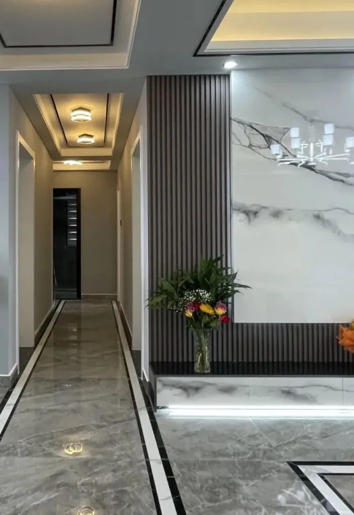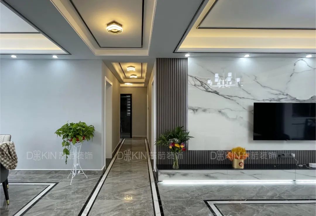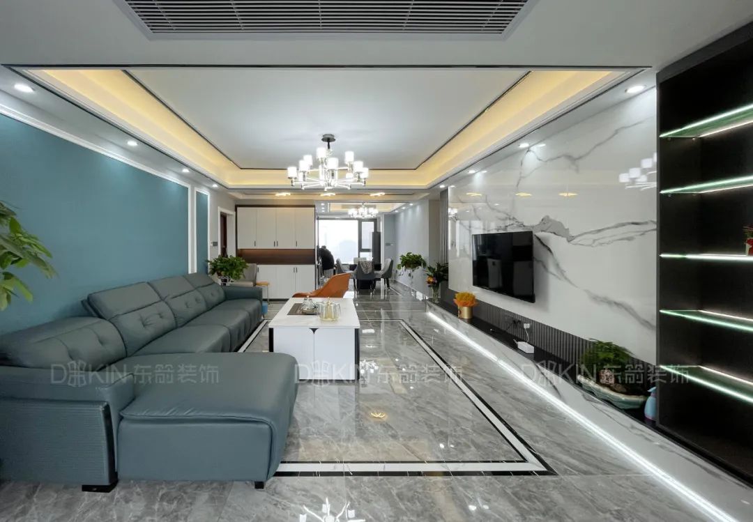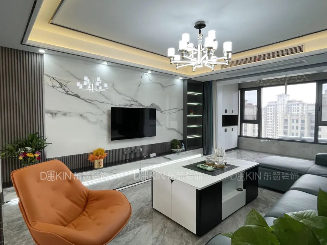 4.电视背景墙采用的是岩板、木饰面、壁台加组合柜设计,现代感十足。