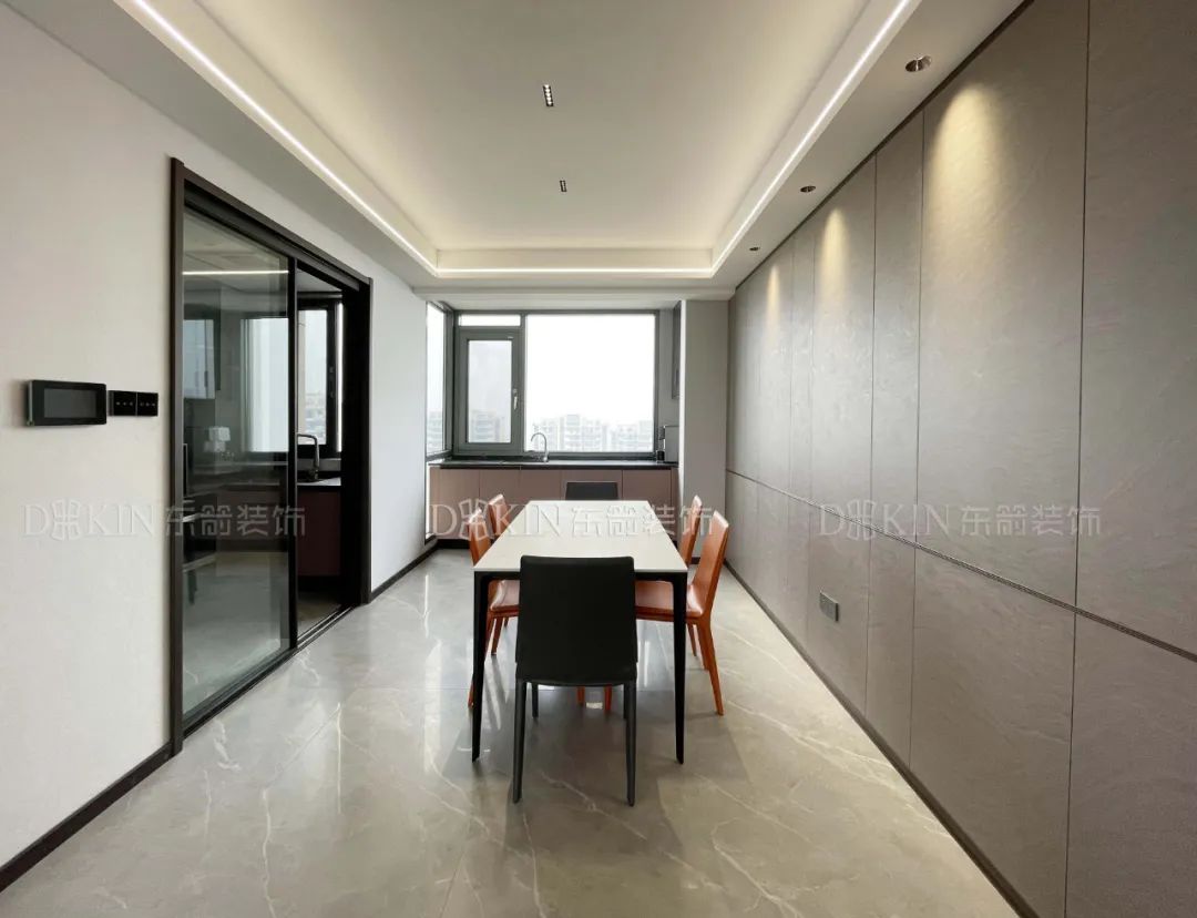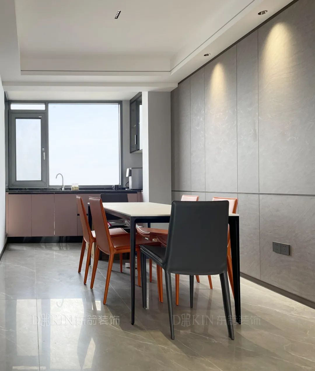 餐厅空间保持自然质感采用了黑白灰风格,水吧台增添实用性和休闲设计感,让家里变得温馨起来。