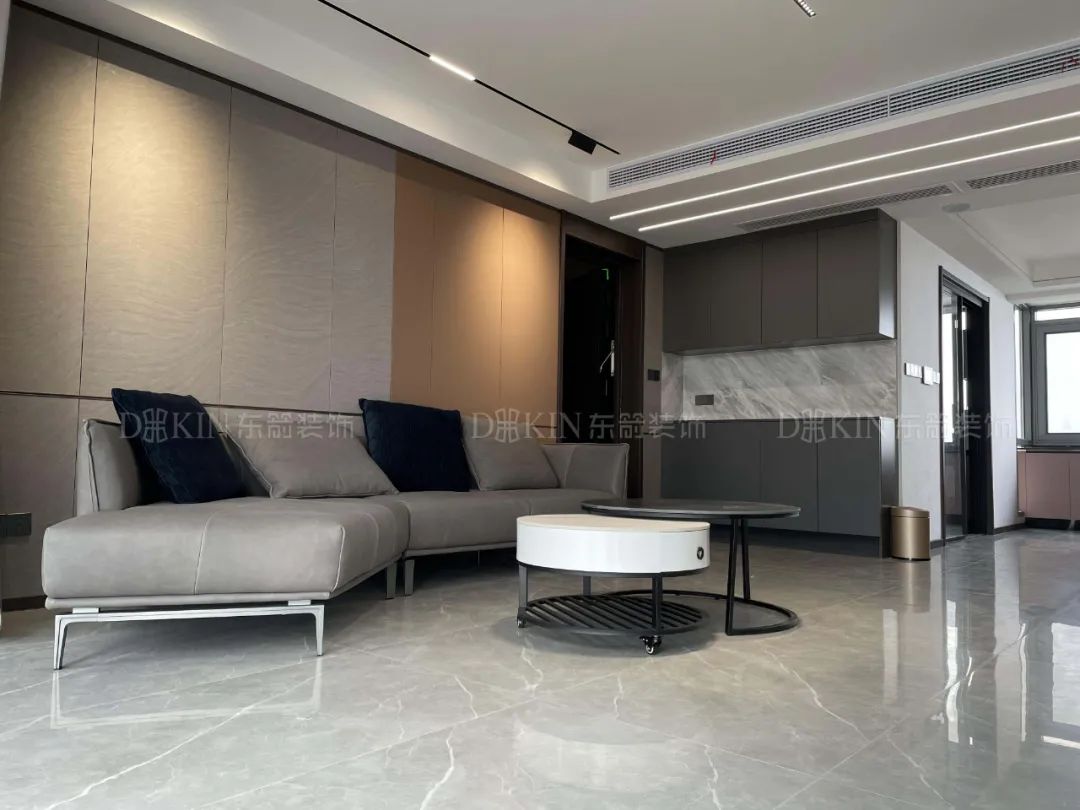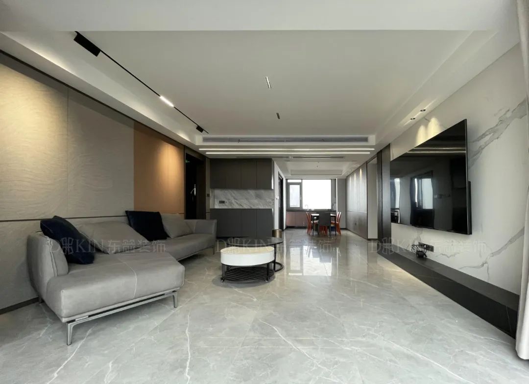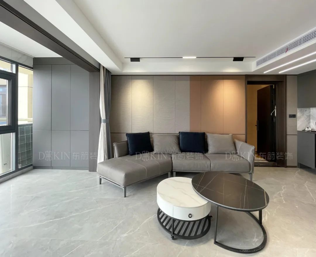 客厅整体南北通透,空间宽阔,岩板和壁台的背景墙,以柔和简单的低饱和度浅灰搭配装饰,自然舒适。