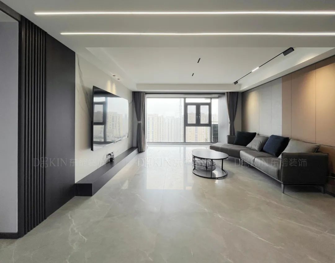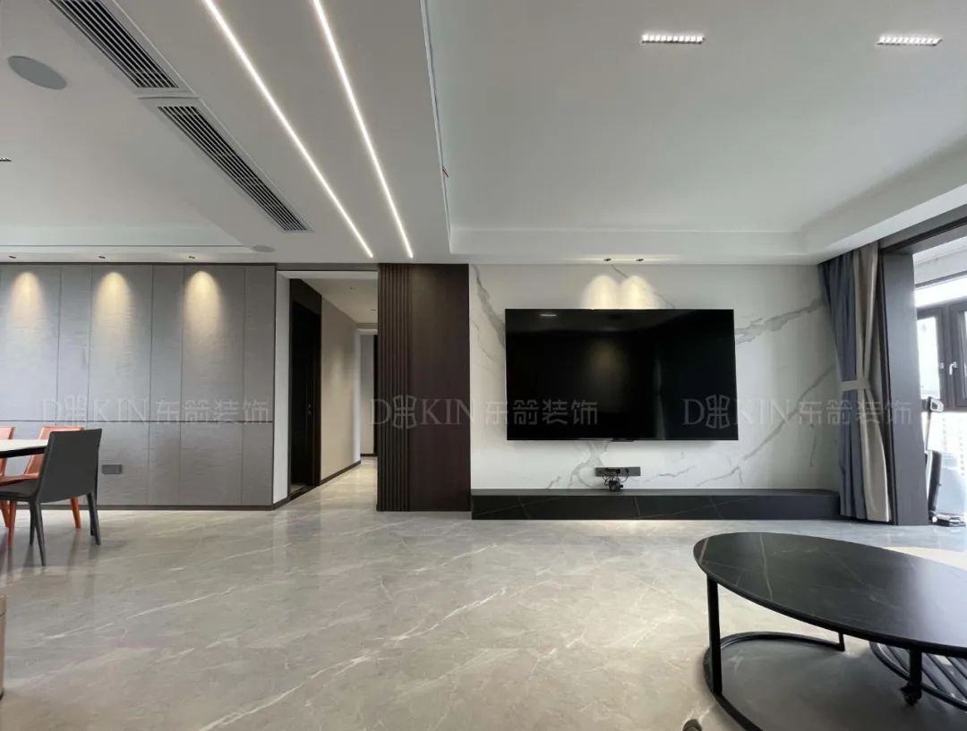 4.客厅采用的是岩板、木饰面、壁台设计,无主灯搭配线条灯带。