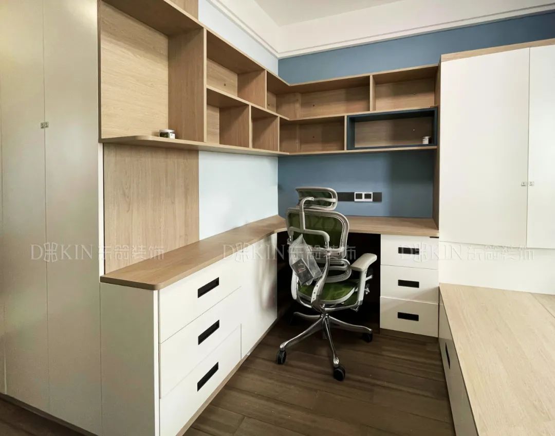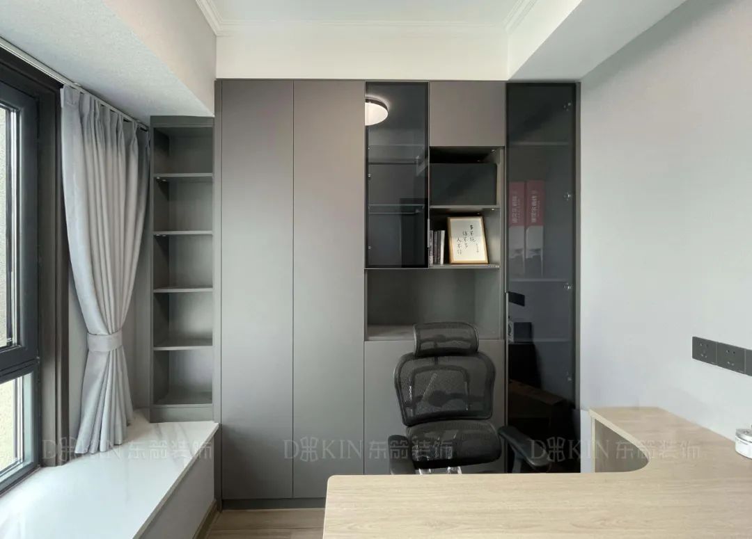 定制书桌和书柜满足办公和阅读需求,灰色搭配也增加了空间设计感和实用性。
