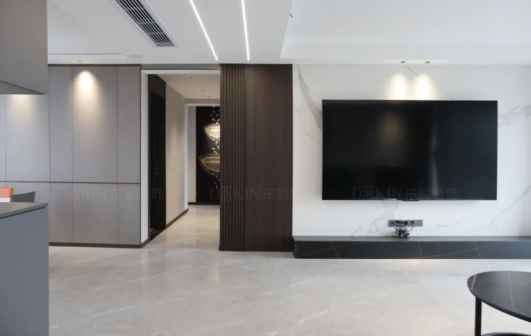 整体空间以黑白灰为主基调,低饱和度和简约材质让整个空间更有层次和设计感。